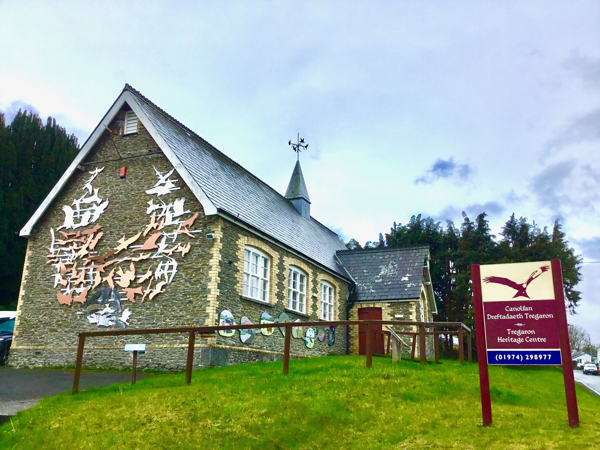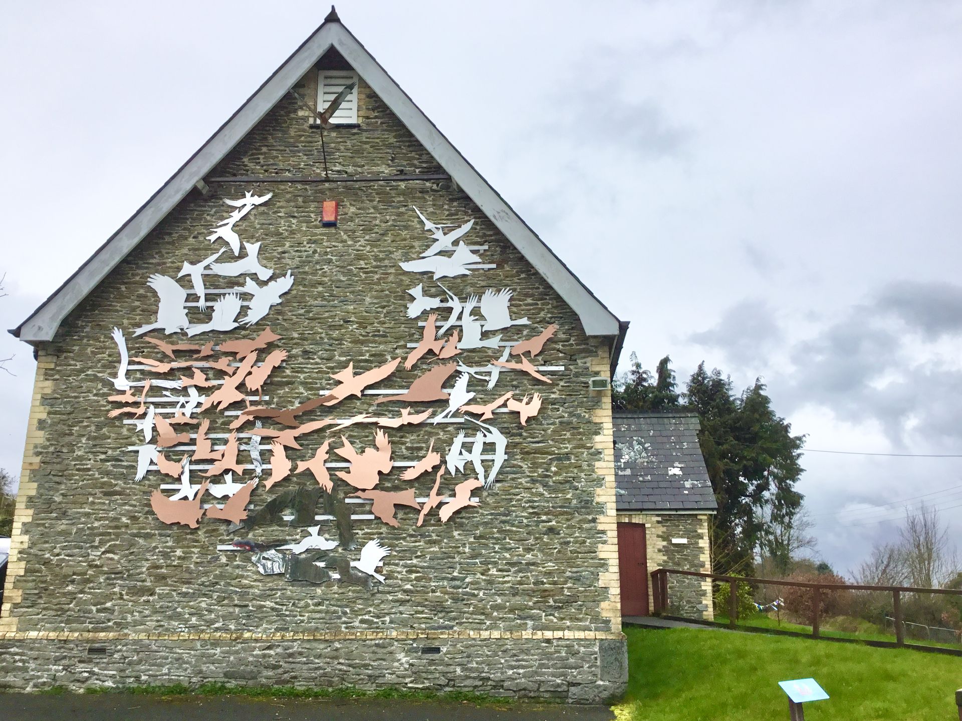 Mae'r gwaith celf hwn, ar wal ddiwedd Yr Hen Ysgol yn Nhregaron yng nghanolbarth Cymru, yn dangos silwetau o Farcutiaid Coch yn hudo. Maent yn ffurfio siâp Colomendy Dewi Sant. Mae chwedl yn sôn am golomen yn cael ei hanfon gan Dduw i ymddangos ochr yn ochr â nawddsant Cymru wrth iddo bregethu yn Llanddewi Brefi, bedair milltir o Dregaron. O fewn y gwaith celf, mae Draig Goch Cymru yn cael ei ddewis yn y lliw copr. Mae’r gwaith celf yn dathlu goroesiad a dadeni Diwylliant ac Iaith Cymru. Yn ôl yn nyddiau’r ‘Welsh Not’, mewn ysgolion fel hon, roedd plant yn cael eu cosbi am siarad eu hiaith frodorol, mewn ymgais swyddogol i atal y Gymraeg. Yn cael ei ddathlu hefyd yma yn y Ganolfan Dreftadaeth mae pwysigrwydd Tregaron yn adfywiad yr aderyn hardd hwn - a ddaeth yn ôl o bron â darfod yng Nghymru ar ôl blynyddoedd o erledigaeth.